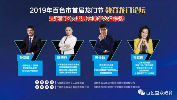 為了給百色的家長和孩子們奉獻(xiàn)一場空前的教育盛宴,論壇邀請到中國商業(yè)禮儀研究院執(zhí)行院長孫劍虹,廣西金珊瑚教育集團(tuán)董事長陳慶芬,南寧市婦女兒童活動中心主任蘇長帥,中國心理健康教育研究院專家韋若理。4位教育名家齊聚一堂,為百色的家長和孩子們帶來了關(guān)于家風(fēng)建設(shè)、家庭教育、芬蘭先進(jìn)兒童教育理念、兒童專注力培養(yǎng)領(lǐng)域的深刻研究見解,贏得了到場家長的肯定和掌聲。