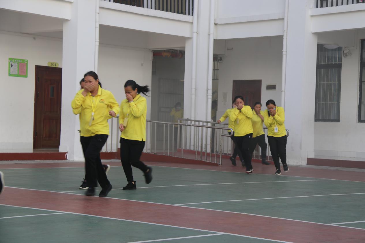 參訓(xùn)人員在模擬火災(zāi)演練中有序進(jìn)行逃生