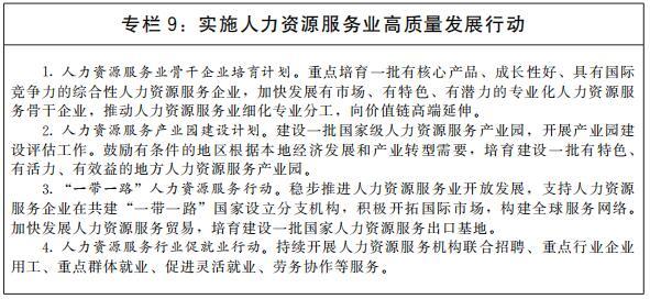 加快人力資源服務(wù)業(yè)高質(zhì)量發(fā)展。推動(dòng)人力資源服務(wù)與實(shí)體經(jīng)濟(jì)融合發(fā)展,引導(dǎo)人力資源服務(wù)機(jī)構(gòu)圍繞產(chǎn)業(yè)基礎(chǔ)高級(jí)化、產(chǎn)業(yè)鏈現(xiàn)代化提供精準(zhǔn)專業(yè)服務(wù)。鼓勵(lì)人力資源服務(wù)業(yè)管理創(chuàng)新、技術(shù)創(chuàng)新、服務(wù)創(chuàng)新和產(chǎn)品創(chuàng)新,大力發(fā)展人力資源管理咨詢、高級(jí)人才尋訪、人才測(cè)評(píng)等高技術(shù)、高附加值業(yè)態(tài)。實(shí)施人力資源服務(wù)業(yè)領(lǐng)軍人才培養(yǎng)計(jì)劃。開展“互聯(lián)網(wǎng)+人力資源服務(wù)”行動(dòng)。深化人力資源服務(wù)領(lǐng)域?qū)ν忾_放,探索建設(shè)國(guó)家人力資源服務(wù)出口基地。