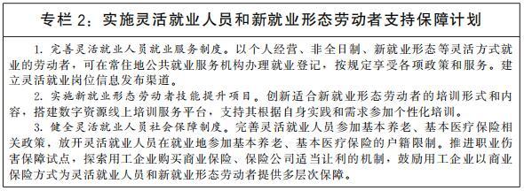 支持多渠道靈活就業(yè)和新就業(yè)形態(tài)發(fā)展。破除各種不合理限制,建立促進(jìn)多渠道靈活就業(yè)機(jī)制,支持和規(guī)范發(fā)展新就業(yè)形態(tài)。鼓勵(lì)傳統(tǒng)行業(yè)跨界融合、業(yè)態(tài)創(chuàng)新,增加靈活就業(yè)和新就業(yè)形態(tài)就業(yè)機(jī)會(huì)。加快落實(shí)《關(guān)于維護(hù)新就業(yè)形態(tài)勞動(dòng)者勞動(dòng)保障權(quán)益的指導(dǎo)意見(jiàn)》,建立完善適應(yīng)靈活就業(yè)和新就業(yè)形態(tài)的勞動(dòng)權(quán)益保障制度,引導(dǎo)支持靈活就業(yè)人員和新就業(yè)形態(tài)勞動(dòng)者參加社會(huì)保險(xiǎn),提高靈活就業(yè)人員和新就業(yè)形態(tài)勞動(dòng)者社會(huì)保障水平。規(guī)范平臺(tái)企業(yè)用工,明確平臺(tái)企業(yè)勞動(dòng)保護(hù)責(zé)任。健全職業(yè)分類動(dòng)態(tài)調(diào)整機(jī)制,持續(xù)開發(fā)新職業(yè),發(fā)布新職業(yè)標(biāo)準(zhǔn)。