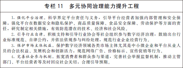 (三)完善多元共治新格局。建立完善政府、平臺、企業(yè)、行業(yè)組織和社會公眾多元參與、有效協(xié)同的數(shù)字經(jīng)濟治理新格局,形成治理合力,鼓勵良性競爭,維護公平有效市場。加快健全市場準入制度、公平競爭審查機制,完善數(shù)字經(jīng)濟公平競爭監(jiān)管制度,預(yù)防和制止濫用行政權(quán)力排除限制競爭。進一步明確平臺企業(yè)主體責任和義務(wù),推進行業(yè)服務(wù)標準建設(shè)和行業(yè)自律,保護平臺從業(yè)人員和消費者合法權(quán)益。開展社會監(jiān)督、媒體監(jiān)督、公眾監(jiān)督,培育多元治理、協(xié)調(diào)發(fā)展新生態(tài)。鼓勵建立爭議在線解決機制和渠道,制定并公示爭議解決規(guī)則。引導(dǎo)社會各界積極參與推動數(shù)字經(jīng)濟治理,加強和改進反壟斷執(zhí)法,暢通多元主體訴求表達、權(quán)益保障渠道,及時化解矛盾糾紛,維護公眾利益和社會穩(wěn)定。