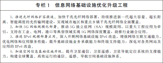 (一)加快建設(shè)信息網(wǎng)絡(luò)基礎(chǔ)設(shè)施。建設(shè)高速泛在、天地一體、云網(wǎng)融合、智能敏捷、綠色低碳、安全可控的智能化綜合性數(shù)字信息基礎(chǔ)設(shè)施。有序推進骨干網(wǎng)擴容,協(xié)同推進千兆光纖網(wǎng)絡(luò)和5G網(wǎng)絡(luò)基礎(chǔ)設(shè)施建設(shè),推動5G商用部署和規(guī)模應(yīng)用,前瞻布局第六代移動通信(6G)網(wǎng)絡(luò)技術(shù)儲備,加大6G技術(shù)研發(fā)支持力度,積極參與推動6G國際標準化工作。積極穩(wěn)妥推進空間信息基礎(chǔ)設(shè)施演進升級,加快布局衛(wèi)星通信網(wǎng)絡(luò)等,推動衛(wèi)星互聯(lián)網(wǎng)建設(shè)。提高物聯(lián)網(wǎng)在工業(yè)制造、農(nóng)業(yè)生產(chǎn)、公共服務(wù)、應(yīng)急管理等領(lǐng)域的覆蓋水平,增強固移融合、寬窄結(jié)合的物聯(lián)接入能力。