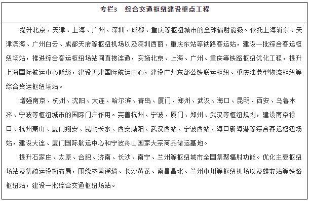 優(yōu)化綜合交通樞紐城市功能。提升國(guó)際性綜合交通樞紐的全球聯(lián)通水平和資源要素配置能力,增強(qiáng)部分樞紐國(guó)際門戶功能。優(yōu)化全國(guó)性綜合交通樞紐客貨中轉(zhuǎn)設(shè)施、集疏運(yùn)網(wǎng)絡(luò)及客運(yùn)場(chǎng)站間快速連接系統(tǒng)。增強(qiáng)區(qū)域性綜合交通樞紐的銜接轉(zhuǎn)運(yùn)能力,發(fā)展口岸樞紐。強(qiáng)化不同層級(jí)綜合交通樞紐城市之間功能互補(bǔ)、設(shè)施連通、運(yùn)行協(xié)同。