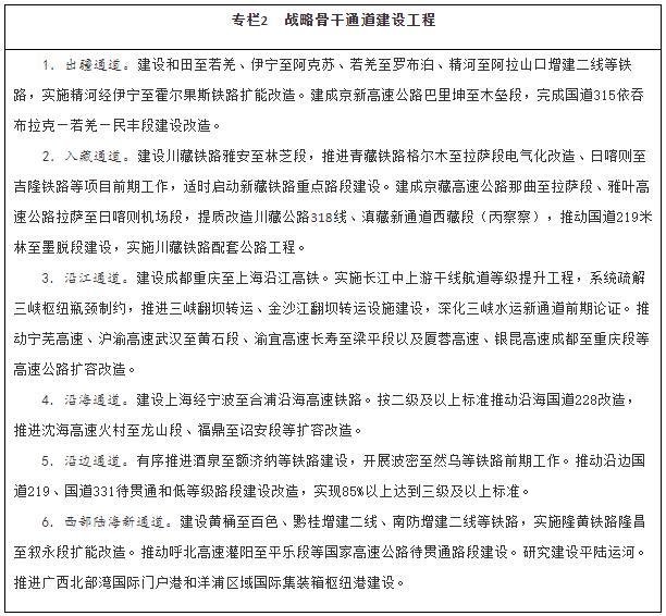 加強(qiáng)戰(zhàn)略骨干通道建設(shè)。推進(jìn)出疆入藏通道建設(shè),擴(kuò)大甘新、青新、青藏、川藏四條內(nèi)聯(lián)主通道通行能力,穩(wěn)步推進(jìn)川藏鐵路建設(shè),加快推進(jìn)新藏鐵路和田至日喀則段前期工作、適時(shí)啟動(dòng)重點(diǎn)路段建設(shè),有序推進(jìn)滇藏鐵路前期工作,密實(shí)優(yōu)化航空航線網(wǎng)絡(luò)布局,構(gòu)建多向聯(lián)通的通道布局。暢通沿江通道,加快建設(shè)沿江高鐵,優(yōu)化以高等級(jí)航道和干線鐵路、高速公路為骨干的沿江綜合運(yùn)輸大通道功能。升級(jí)沿海通道,提高鐵路通道能力,推進(jìn)高速公路繁忙路段擴(kuò)容改造,提升港口航道整體效能,構(gòu)建大容量、高品質(zhì)的運(yùn)輸走廊。貫通沿邊通道,提級(jí)改造普通國(guó)省干線,推進(jìn)重點(diǎn)方向沿邊鐵路建設(shè),提高安全保障水平。建設(shè)西部陸海新通道,發(fā)揮鐵路在陸路運(yùn)輸中的骨干作用和港口在海上運(yùn)輸中的門戶作用,強(qiáng)化東、中、西三條通路,形成大能力主通道,銜接國(guó)際運(yùn)輸通道。
