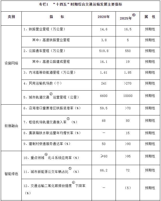 注:①〔〕內(nèi)為5年累計(jì)數(shù)。②指納入國(guó)家批準(zhǔn)的城市軌道交通建設(shè)規(guī)劃中的大中運(yùn)量城市軌道交通項(xiàng)目。③指國(guó)際樞紐機(jī)場(chǎng)和區(qū)域樞紐機(jī)場(chǎng)中連通軌道交通的機(jī)場(chǎng)數(shù)量占比。④指重點(diǎn)營(yíng)運(yùn)車輛、郵政快遞自有干線運(yùn)輸車輛、應(yīng)安裝具備衛(wèi)星定位功能船載設(shè)備的客船及危險(xiǎn)品船等。⑤指新能源公交車輛占所有地面公交車輛的比重。⑥指按單位運(yùn)輸周轉(zhuǎn)量計(jì)算的二氧化碳排放。