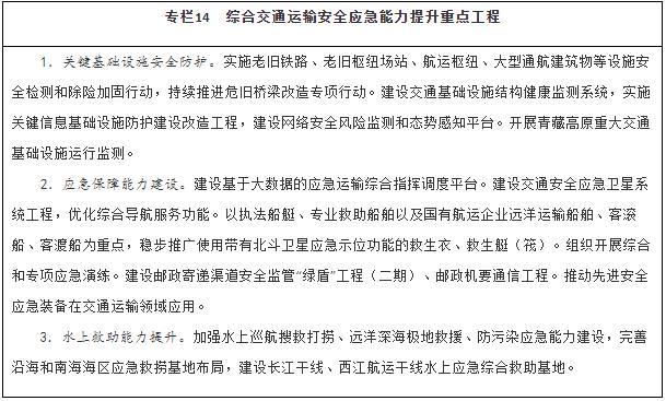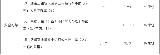 安全保障更加可靠。交通設(shè)施耐久可靠、運(yùn)行安全可控、防范措施到位,安全設(shè)施完好率持續(xù)提高??绮块T、跨領(lǐng)域的安全風(fēng)險(xiǎn)防控體系和應(yīng)急救援體系進(jìn)一步健全,重特大事故發(fā)生率進(jìn)一步降低。主要通道運(yùn)輸安全和糧食、能源、礦石等物資運(yùn)輸安全更有保障,國(guó)際物流供應(yīng)鏈安全保障能力持續(xù)提升。