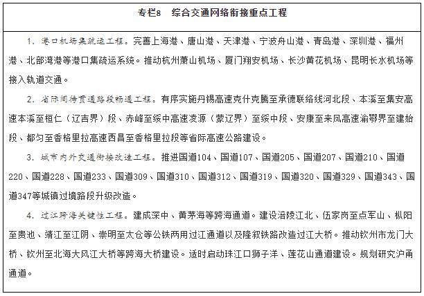 建設(shè)多節(jié)點(diǎn)、網(wǎng)格狀、全覆蓋的京津冀一體化綜合交通網(wǎng)絡(luò),基本建成軌道上的京津冀,高標(biāo)準(zhǔn)、高質(zhì)量打造雄安新區(qū)對(duì)外交通網(wǎng)絡(luò),加強(qiáng)北京城市副中心與中心城區(qū)、廊坊北三縣交通基礎(chǔ)設(shè)施互聯(lián)互通,強(qiáng)化北京冬奧會(huì)、冬殘奧會(huì)交通保障。依托長(zhǎng)江黃金水道,整體設(shè)計(jì)推進(jìn)長(zhǎng)江經(jīng)濟(jì)帶綜合交通運(yùn)輸體系建設(shè),補(bǔ)強(qiáng)沿江高鐵和鐵路貨運(yùn)能力,全力打通公路省際待貫通路段,提升江海聯(lián)運(yùn)、鐵水聯(lián)運(yùn)發(fā)展水平。推進(jìn)粵港澳大灣區(qū)基礎(chǔ)設(shè)施互聯(lián)互通,優(yōu)化航運(yùn)和航空資源配置,加強(qiáng)港澳與內(nèi)地的交通聯(lián)系,支持香港提升國(guó)際航運(yùn)、國(guó)際航空樞紐地位。推動(dòng)長(zhǎng)三角地區(qū)交通運(yùn)輸更高質(zhì)量一體化發(fā)展,加快對(duì)外交通、城際交通、都市圈交通高效銜接和有機(jī)融合,協(xié)同推進(jìn)港航、海事一體化發(fā)展,推動(dòng)上海市、江蘇省、浙江省、安徽省共建輻射全球的航運(yùn)樞紐,加快提升江蘇通州灣江海聯(lián)動(dòng)示范區(qū)功能,打造長(zhǎng)江集裝箱運(yùn)輸新出???。構(gòu)建海南島內(nèi)暢通、陸島連通、全球通達(dá)的現(xiàn)代綜合交通運(yùn)輸體系,建設(shè)現(xiàn)代化綜合交通樞紐,穩(wěn)步推進(jìn)自由貿(mào)易港建設(shè)。構(gòu)建黃河流域綠色安全便捷綜合交通網(wǎng)絡(luò),強(qiáng)化跨區(qū)域大通道建設(shè)。