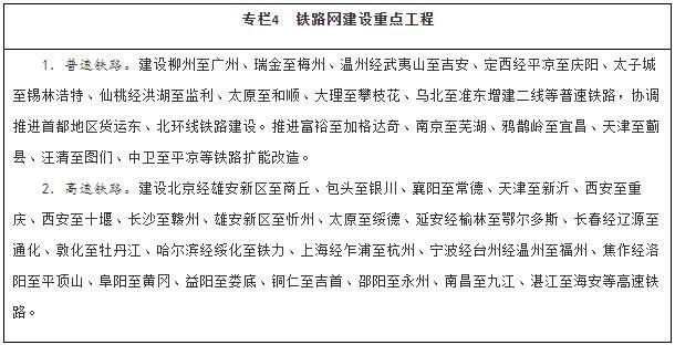建設(shè)現(xiàn)代化鐵路網(wǎng)。堅(jiān)持客貨并重、新建改建并舉、高速普速協(xié)調(diào)發(fā)展,加快普速鐵路建設(shè)和既有鐵路擴(kuò)能改造,著力消除干線瓶頸,推進(jìn)既有鐵路運(yùn)能緊張路段能力補(bǔ)強(qiáng),加快提高中西部地區(qū)鐵路網(wǎng)覆蓋水平。加強(qiáng)資源富集區(qū)、人口相對(duì)密集脫貧地區(qū)的開發(fā)性鐵路和支線鐵路建設(shè)。推進(jìn)高速鐵路主通道建設(shè),提升沿江、沿海、呼南、京昆等重要通道以及京滬高鐵輔助通道運(yùn)輸能力,有序建設(shè)區(qū)域連接線。綜合運(yùn)用新技術(shù)手段,改革創(chuàng)新經(jīng)營(yíng)管理模式,提高鐵路網(wǎng)整體運(yùn)營(yíng)效率。統(tǒng)籌考慮運(yùn)輸需求和效益,合理規(guī)劃建設(shè)鐵路項(xiàng)目,嚴(yán)控高速鐵路平行線路建設(shè)。
