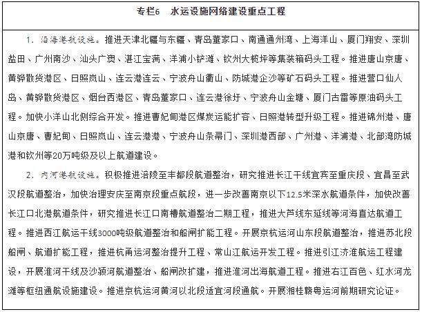 優(yōu)化暢通水運(yùn)設(shè)施網(wǎng)絡(luò)。建設(shè)京津冀、長(zhǎng)三角、粵港澳大灣區(qū)世界級(jí)港口群,支持山東打造世界一流的海洋港口,推進(jìn)東北地區(qū)沿海港口一體化發(fā)展,優(yōu)化港口功能布局,推動(dòng)資源整合和共享共用。有序推進(jìn)沿海港口專業(yè)化碼頭及進(jìn)出港航道等公共設(shè)施建設(shè)。適度超前建設(shè)糧食、能源、礦產(chǎn)資源的接卸、儲(chǔ)存、中轉(zhuǎn)設(shè)施,推進(jìn)沿海沿江液化天然氣碼頭規(guī)劃建設(shè)。提升內(nèi)河港口專業(yè)化、規(guī)?;剑侠砑胁季旨b箱、煤炭、鐵礦石、商品汽車等專業(yè)化碼頭。加強(qiáng)內(nèi)河高等級(jí)航道擴(kuò)能升級(jí)與暢通攻堅(jiān)建設(shè),完善長(zhǎng)江、珠江、京杭運(yùn)河和淮河等水系內(nèi)河高等級(jí)航道網(wǎng)絡(luò),進(jìn)一步提升珠三角高等級(jí)航道網(wǎng)出海能力,全面加強(qiáng)長(zhǎng)三角、珠江—西江高等級(jí)航道網(wǎng)未達(dá)標(biāo)段建設(shè)。推動(dòng)重要支流航道和庫(kù)湖區(qū)航道、內(nèi)河旅游航道、便民碼頭建設(shè)。