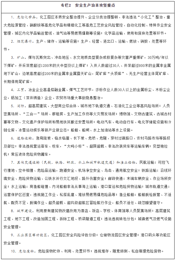 深化專項整治。深入推進危險化學(xué)品、礦山、消防、交通運輸、建筑施工、民爆、特種設(shè)備、大型商業(yè)綜合體等重點行業(yè)領(lǐng)域安全整治,解決影響制約安全生產(chǎn)的薄弱環(huán)節(jié)和突出問題,督促企業(yè)嚴(yán)格安全管理、加大安全投入、落實風(fēng)險管控措施。結(jié)合深化供給側(cè)結(jié)構(gòu)性改革,推動安全基礎(chǔ)薄弱、安全保障能力低下且整改后仍不達標(biāo)的企業(yè)退出市場。統(tǒng)籌考慮危險化學(xué)品企業(yè)搬遷和項目建設(shè)審批,優(yōu)先保障符合條件企業(yè)的搬遷用地。持續(xù)推進企業(yè)安全生產(chǎn)標(biāo)準(zhǔn)化建設(shè),實現(xiàn)安全管理、操作行為、設(shè)施設(shè)備和作業(yè)環(huán)境規(guī)范化。推動淘汰落后技術(shù)、工藝、材料和設(shè)備,加大重點設(shè)施設(shè)備、儀器儀表檢驗檢測力度。推動各類金融機構(gòu)出臺優(yōu)惠貸款等金融類產(chǎn)品,大力推廣新技術(shù)、新工藝、新材料和新裝備,實施智能化礦山、智能化工廠、數(shù)字化車間改造,開展智能化作業(yè)和危險崗位機器人替代示范。強化危險廢物全過程監(jiān)管,動態(tài)修訂《國家危險廢物名錄》,修訂危險廢物鑒別、貯存以及水泥窯協(xié)同處置污染控制等標(biāo)準(zhǔn),制定完善危險廢物重點監(jiān)管單位清單。建立廢棄危險化學(xué)品等危險廢物監(jiān)管協(xié)作和聯(lián)合執(zhí)法工作機制,加強危險廢物監(jiān)管能力與應(yīng)急處置技術(shù)支持能力建設(shè)。